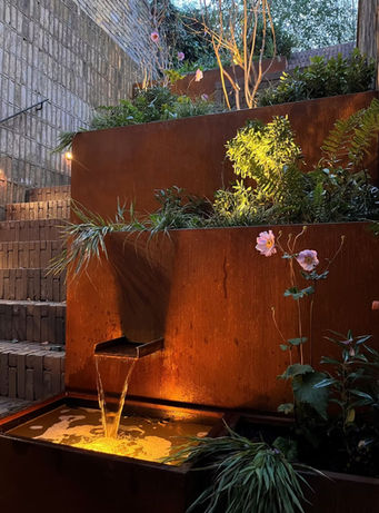 A range of landscape and architectural lighting techniques were employed. Solid copper recessed eyelids and step markers complemented the stone-clad walls and Corten planters, creating a timeless aesthetic that will age beautifully. The water feature was softly lit to enhance the tranquillity of running water, while multi-stem trees were up-lit to add depth and dimension across the varied levels.